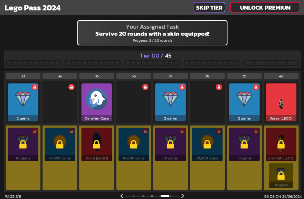 5. Hello everyone and welcome to a new season ! You will be able to find further details regarding the LEGO Pass 2024, available in-game from 25/04 until 24/06. You can unlock Premium rewards with 150 Gems or through our store packages. Available Rewards This Battle pass includes 14 LEGO themed skins, a bunch of cases, gems and coins to unlock through 45 tiers. Here's a breakdown of the exclusive skins: Tier 1 - Knuckles Tier 5 - Sonic / Shaggy Tier 10 - Shadow / Stormtrooper Tier 15 - Yoda Tier 20 - Chell / Jawa Tier 25 - Walter White Tier 30 - Jesse Pinkman / Squidward Tier 35 - Droid Tier 40 - Emmet Tier 45 - Tall Yoda Note: Premium rewards are indicated in Yellow How to level up through the Battle Pass As stated above, LEGO Pass 2024 is available from 25/04/2024 until 24/06/2024. During that timeframe, you will be able to progress through it and unlock associated rewards. This is how it works: you get assigned one task per tier - example: kill 5 players upon task completion, you will be granted 1 tier and assigned a new task to complete rewards of unlocked tier will be available to claim - you must own Premium Pass to claim Premium rewards